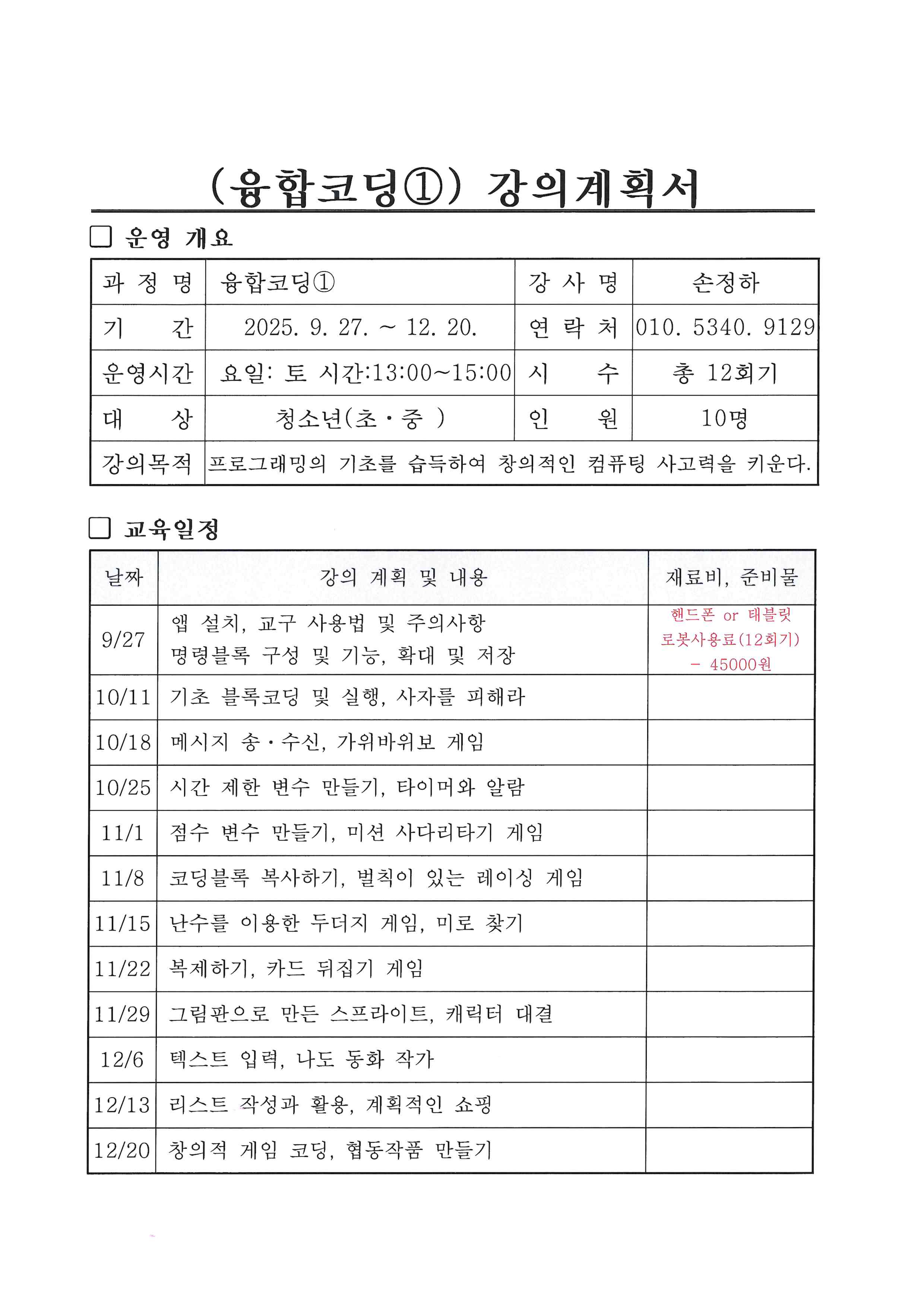 ※ 자세한 준비물 및 수업관련 문의는 강사선생님께 문의바랍니다.