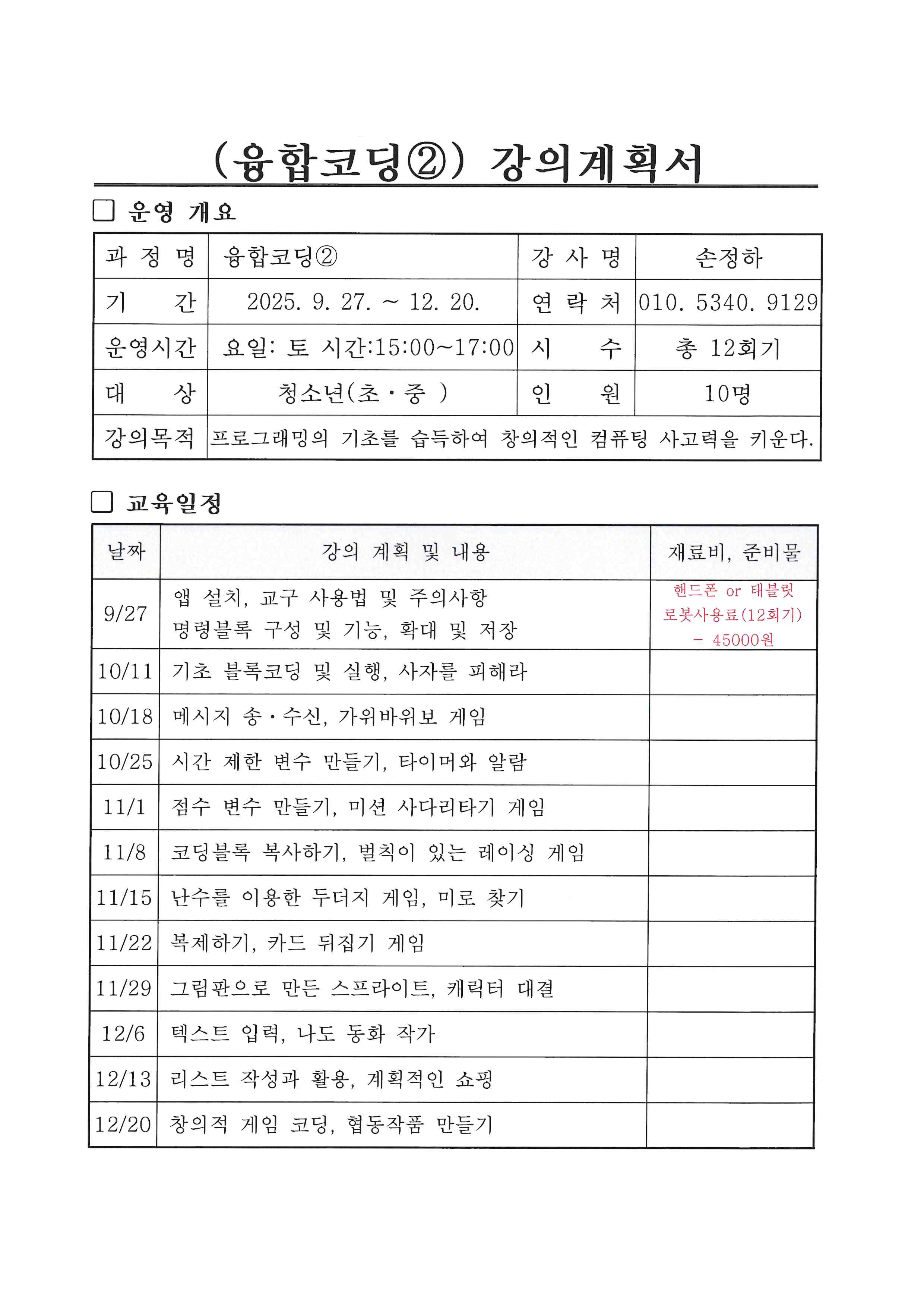 ※ 자세한 준비물 및 수업관련 문의는 강사선생님께 문의바랍니다.