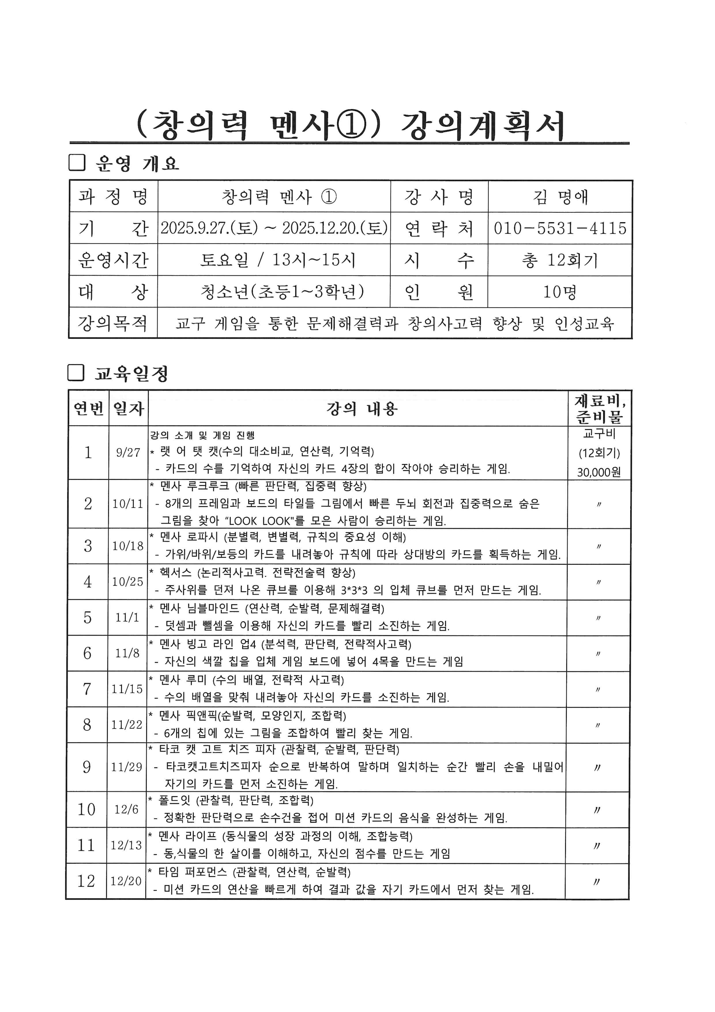 ※ 자세한 준비물 및 수업관련 문의는 강사선생님께 문의바랍니다.