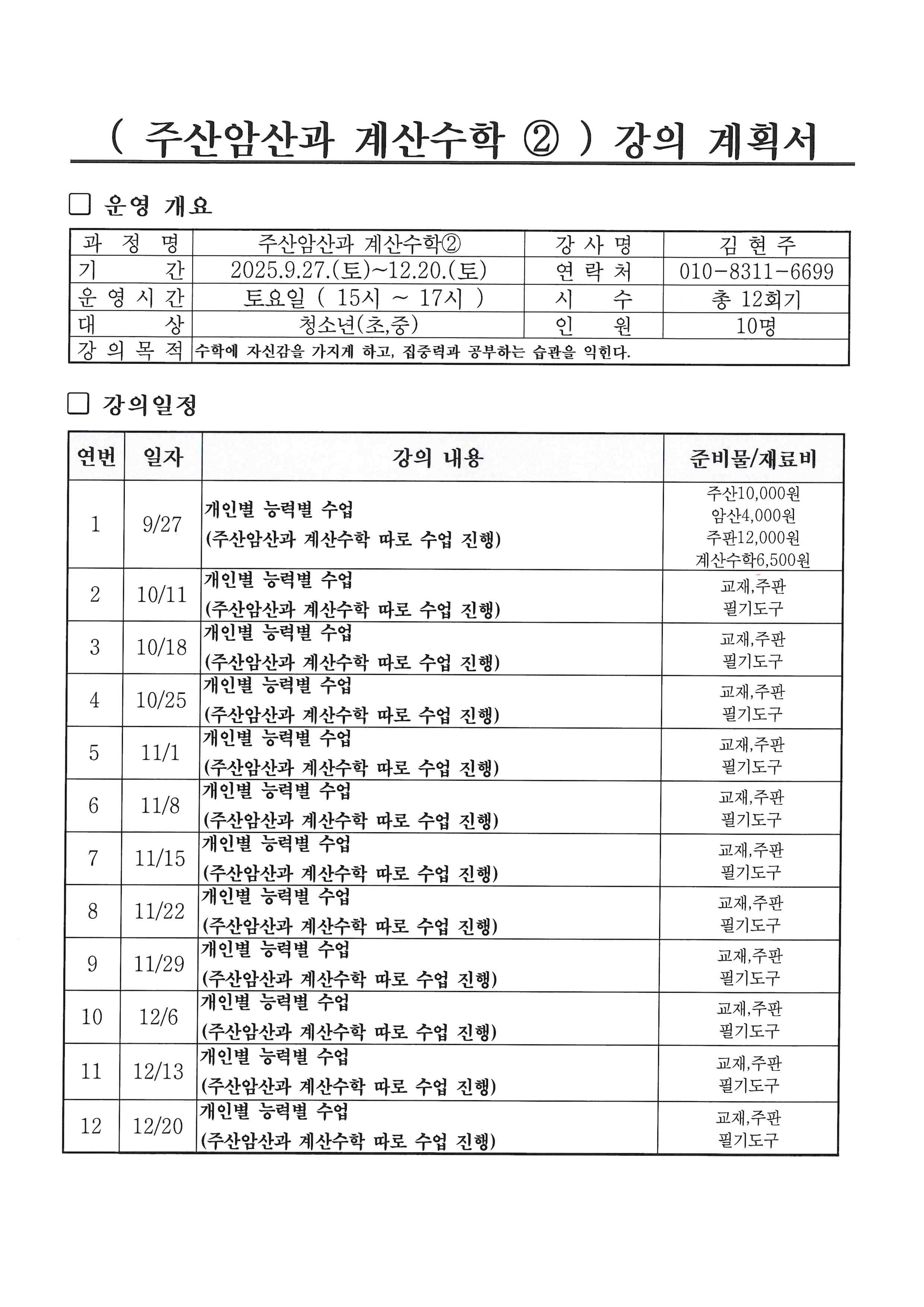 ※ 자세한 준비물 및 수업관련 문의는 강사선생님께 문의바랍니다.