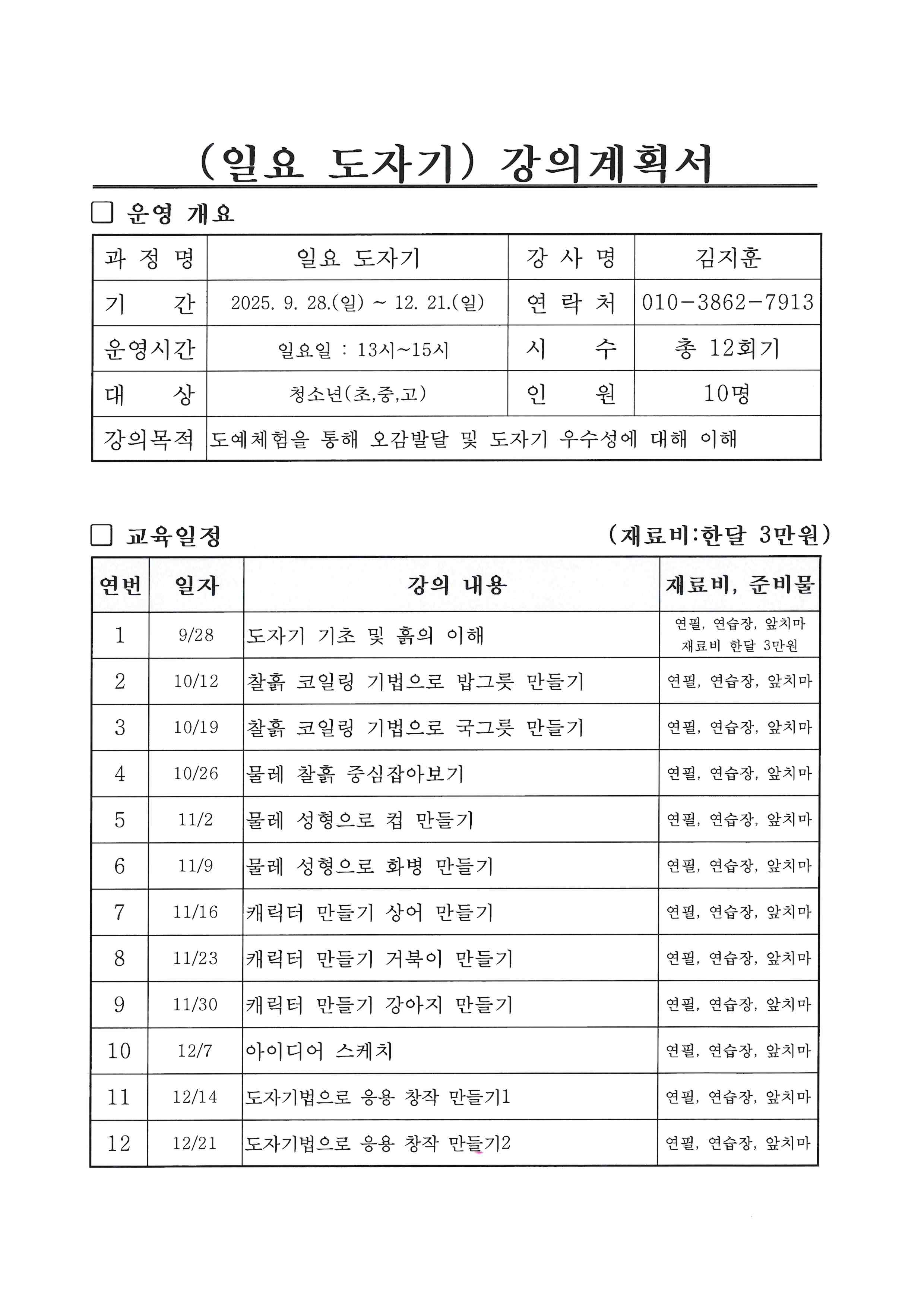 ※ 자세한 준비물 및 수업관련 문의는 강사선생님께 문의바랍니다.
