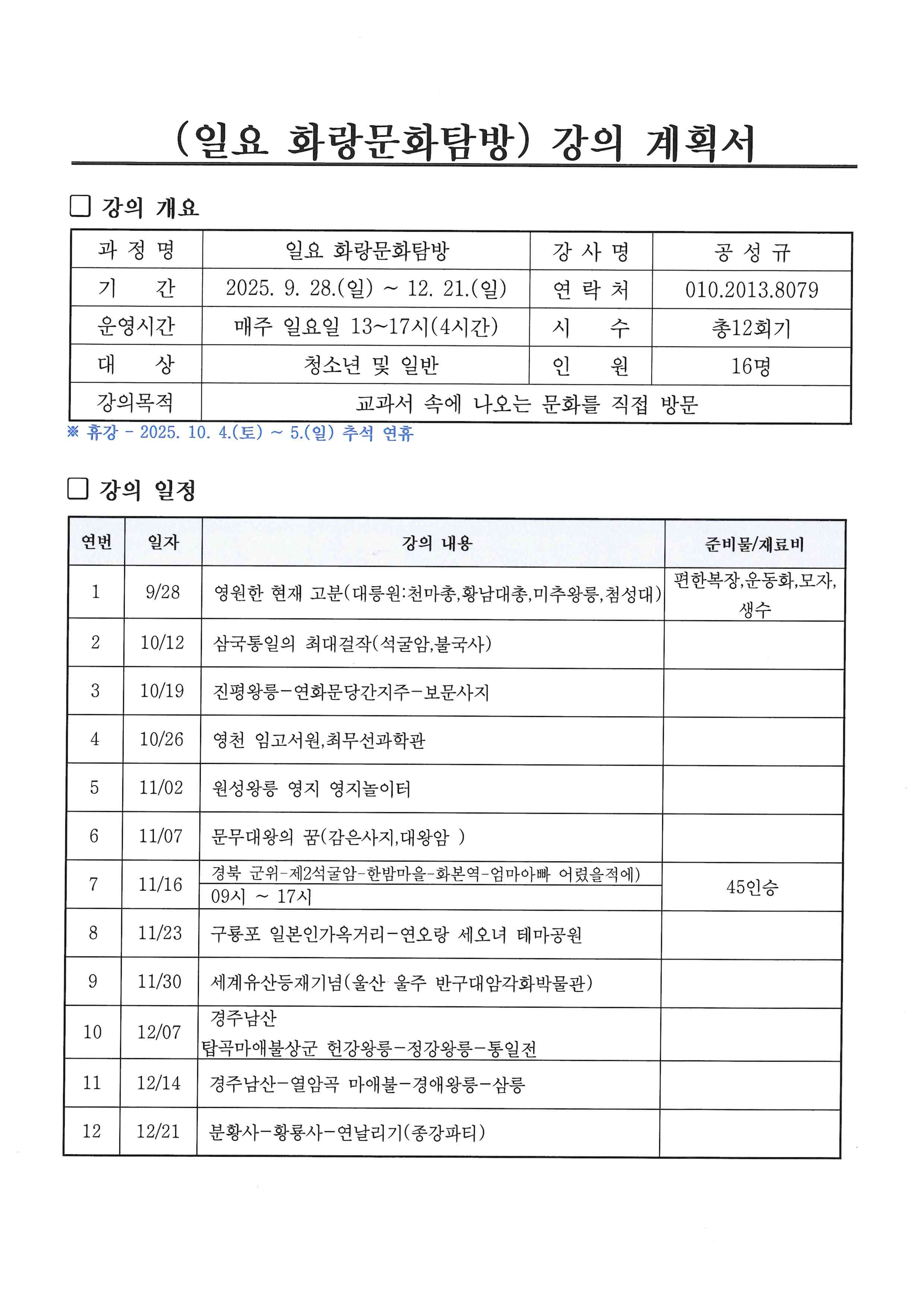 ※ 11월 16일 수업은 관외활동으로 09:00~17:00까지 일정입니다.