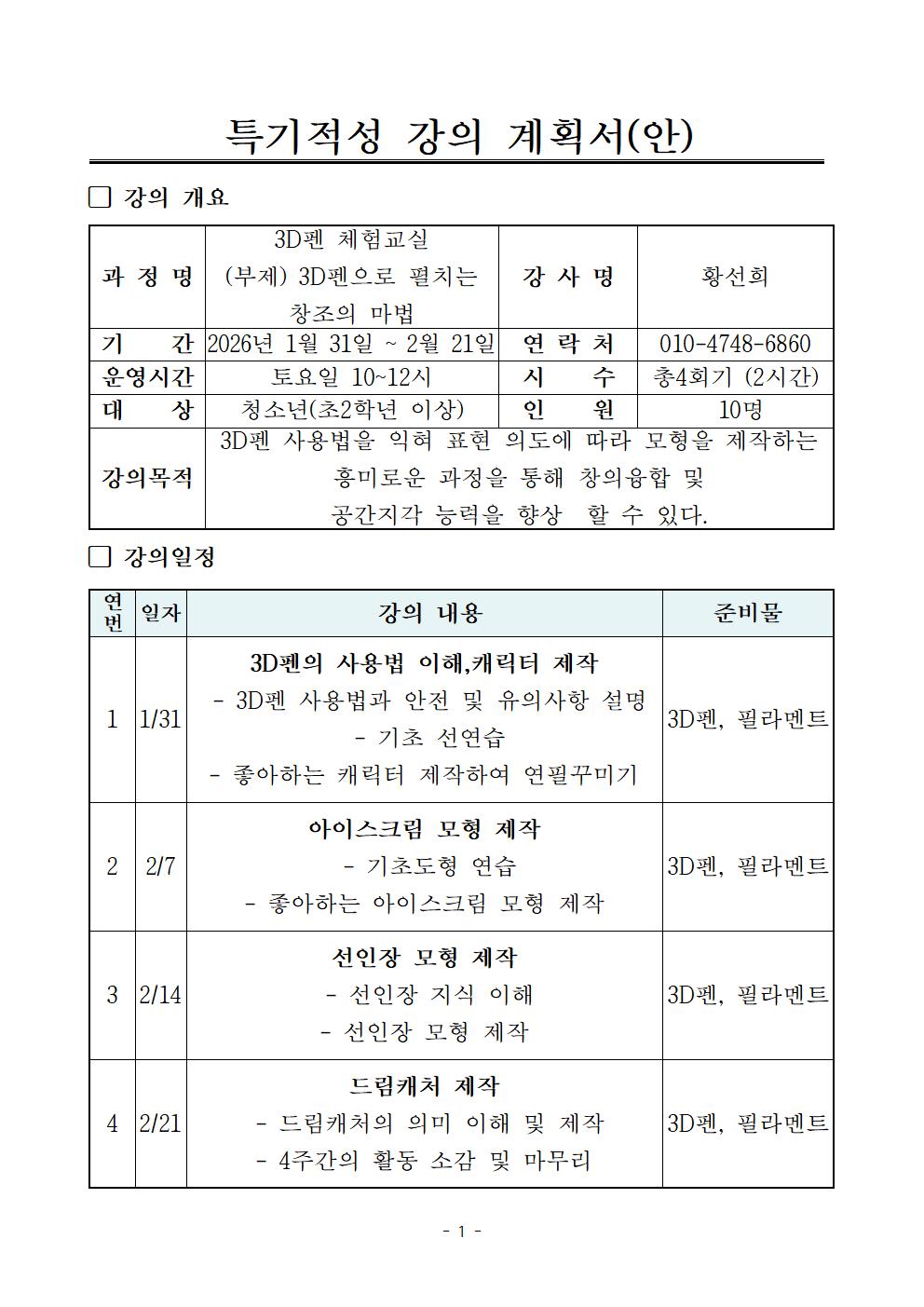 - 일 정 : 매주 토요일 10:00~12:00 (4회기)