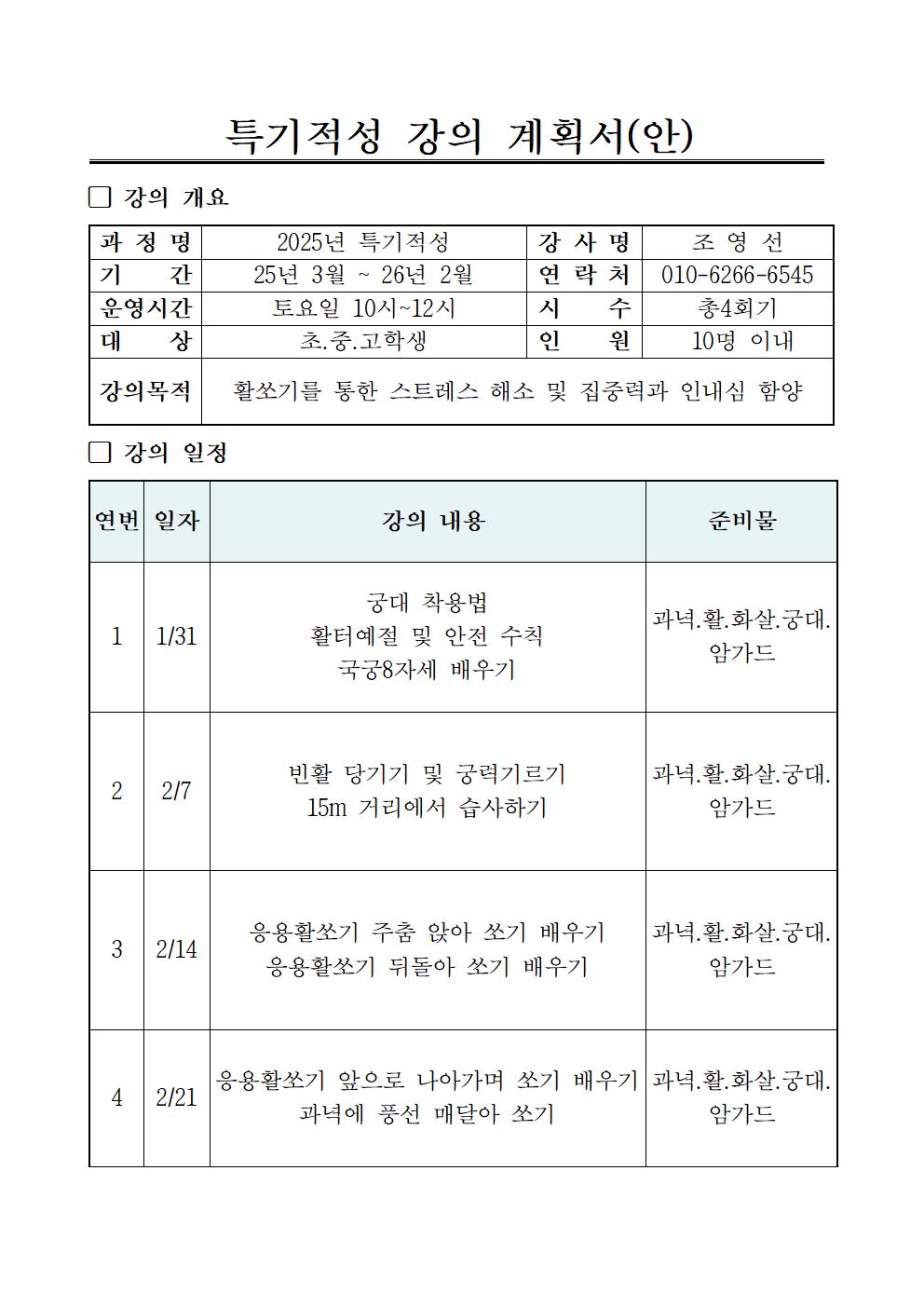 - 일 정 : 매주 토요일 10:00~12:00 (4회기)