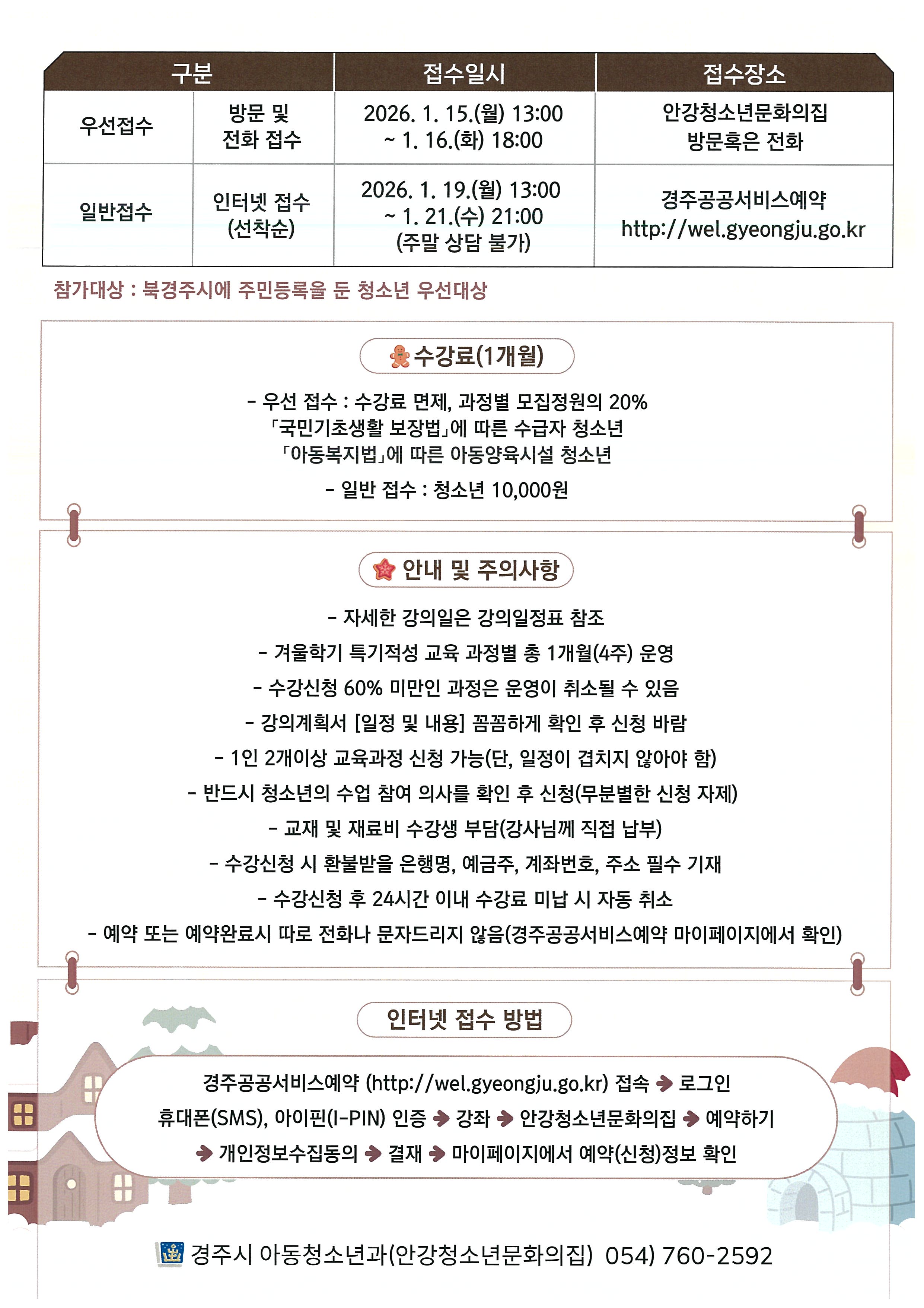 - 대 상 : 북경주 청소년 우선대상(초등 2학년이상) 10명