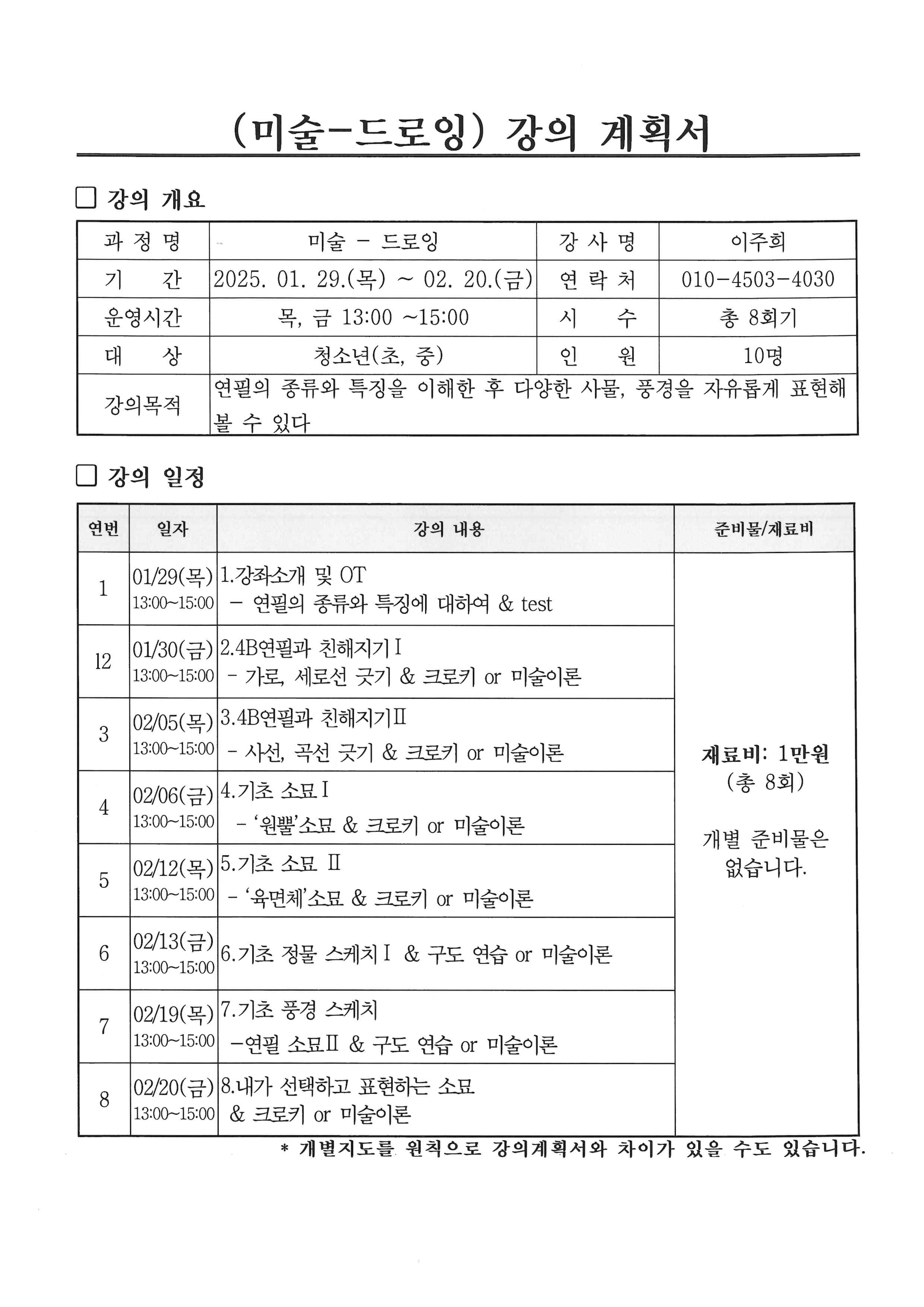 ※ 자세한 준비물 및 수업관련 문의는 강사선생님께 문의바랍니다.