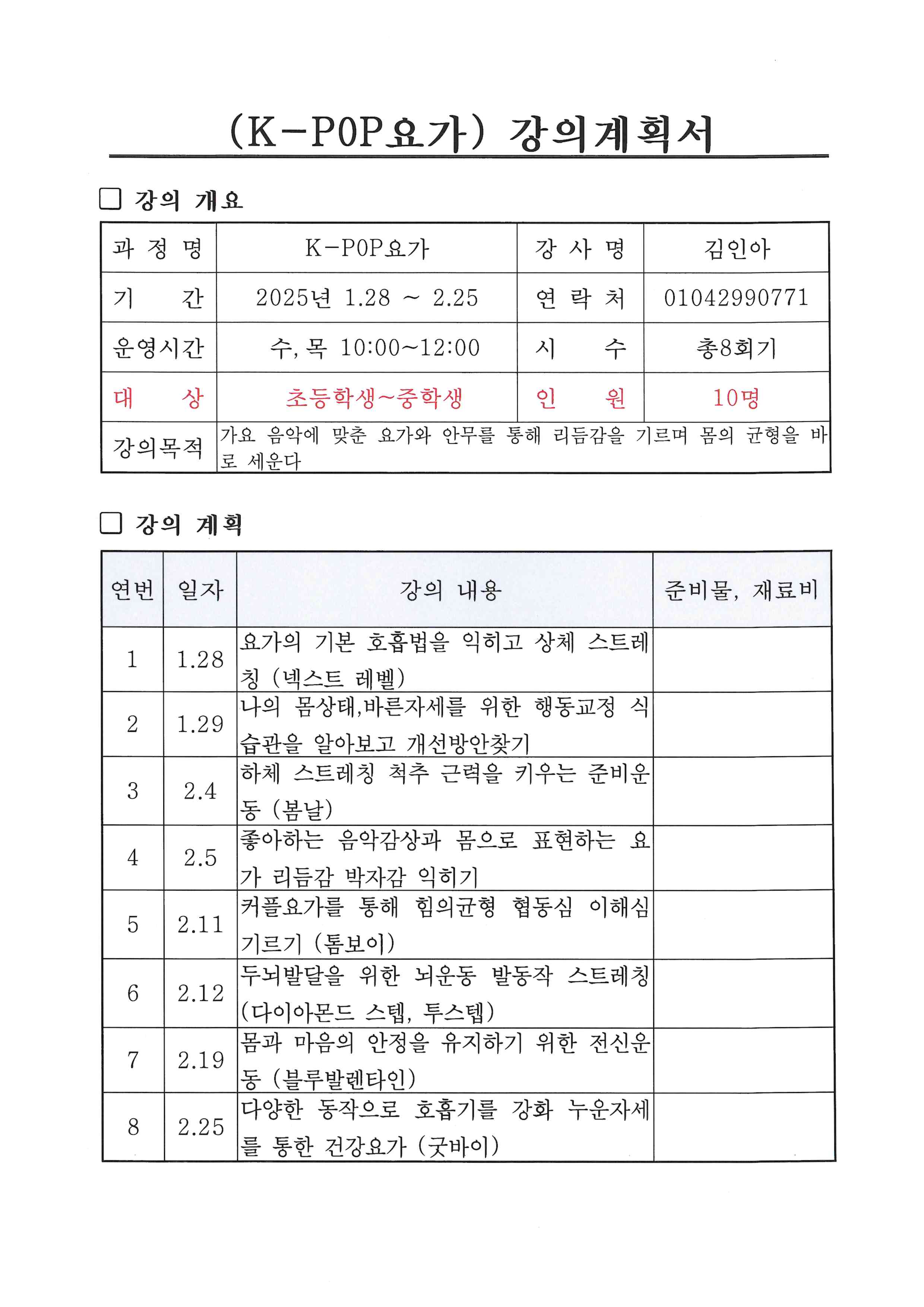 ※ 자세한 준비물 및 수업관련 문의는 강사선생님께 문의바랍니다.