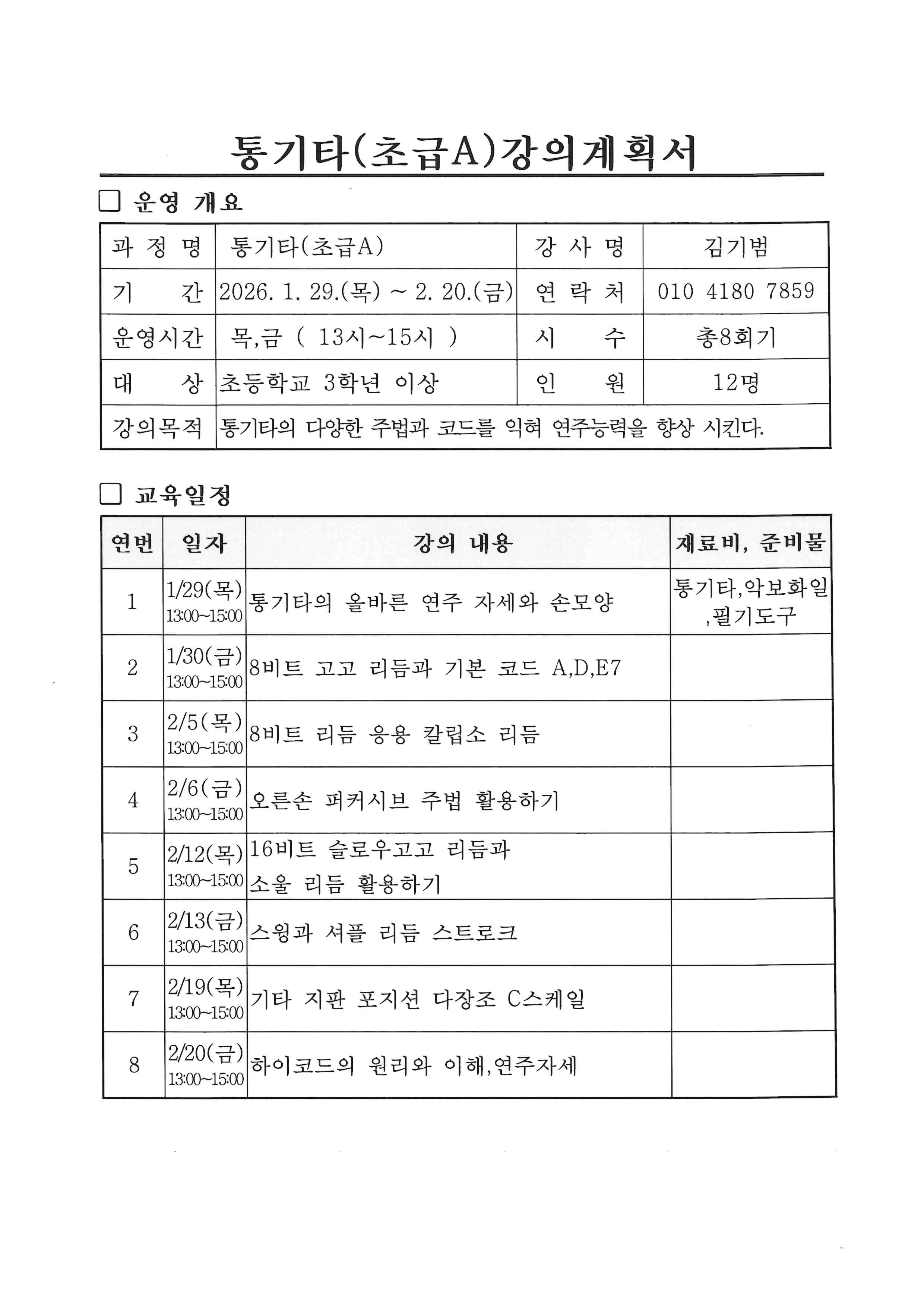 ※ 자세한 준비물 및 수업관련 문의는 강사선생님께 문의바랍니다.