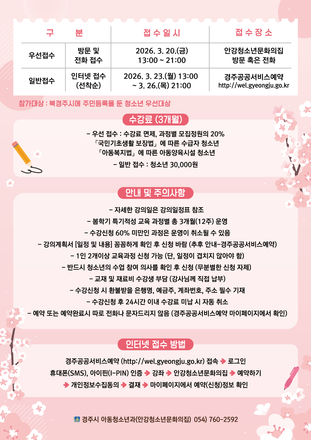 ※ 일반접수 : 2026년 3월 23일(월) 13:00 ~ 3월 26일(목) 21:00 인터넷(선착순) / 경주공공서비스예약