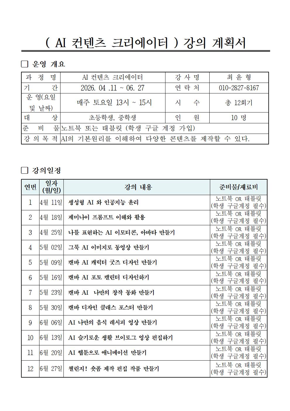 ※ 자세한 준비물 및 수업관련 문의는 강사선생님께 문의바랍니다.