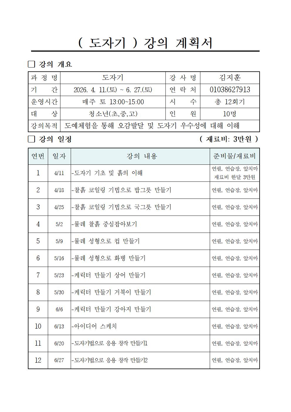 ※ 자세한 준비물 및 수업관련 문의는 강사선생님께 문의바랍니다.