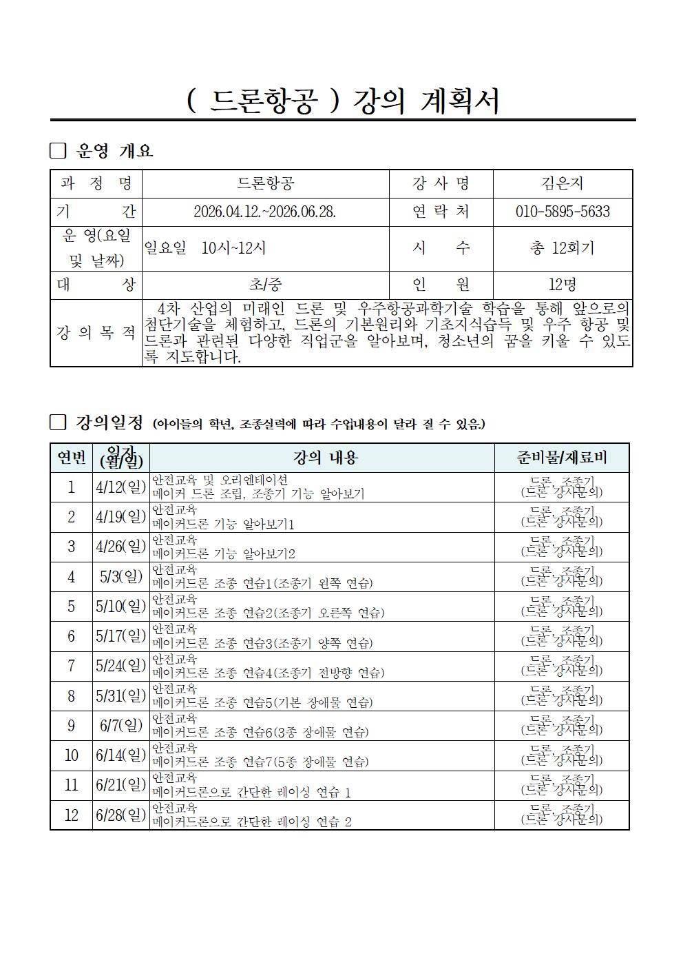 ※ 자세한 준비물 및 수업관련 문의는 강사선생님께 문의바랍니다.