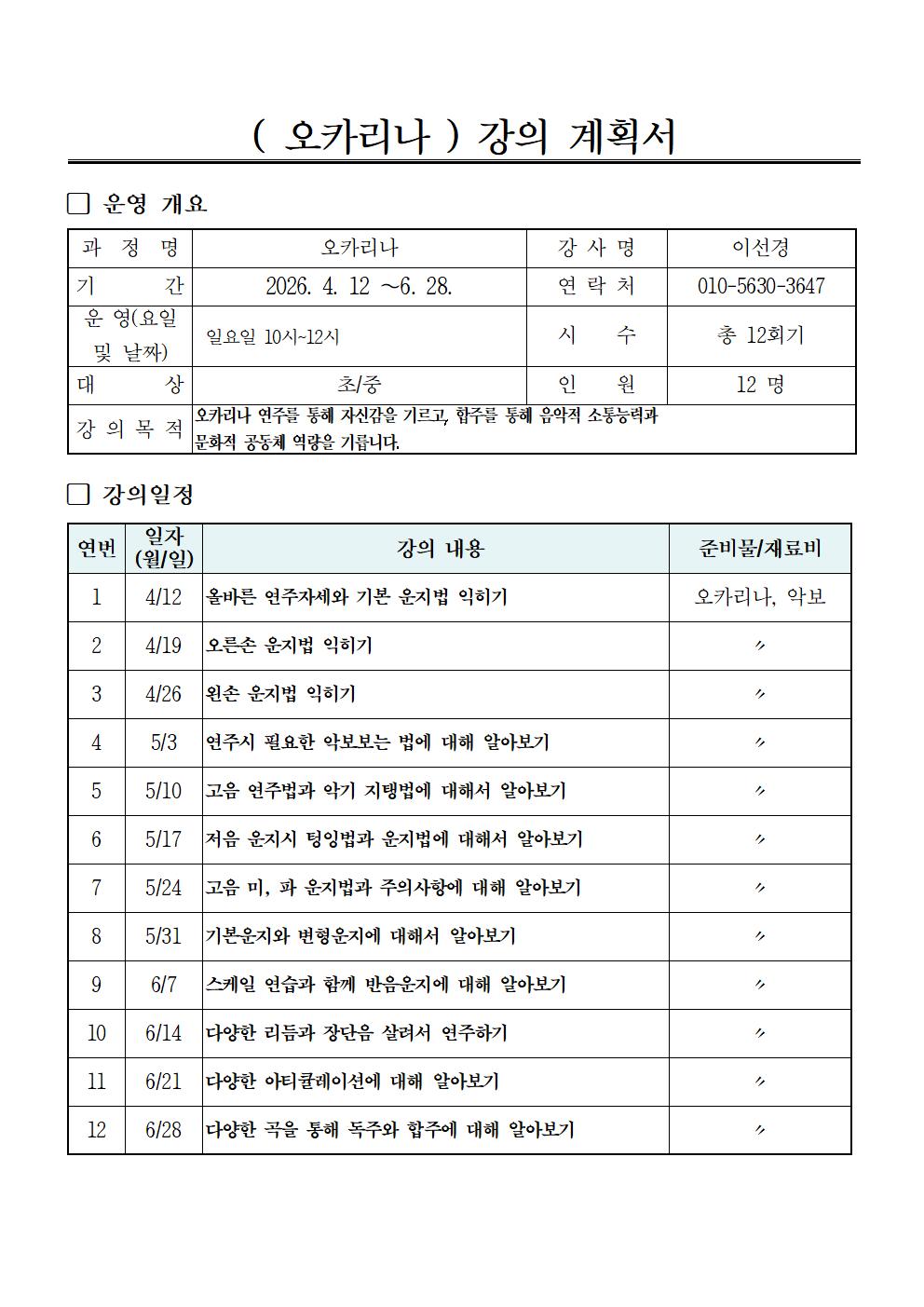 ※ 자세한 준비물 및 수업관련 문의는 강사선생님께 문의바랍니다.
